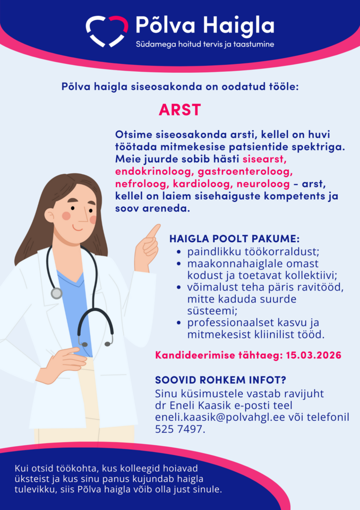Põlva haigla siseosakonda on oodatud tööle ARST, kellel on huvi töötada mitmekesise patsientide spektriga. Meie juurde sobib hästi sisearst, endokrinoloog, gastroenteroloog, nefroloog, kardioloog, neuroloog – arst, kellel on laiem sisehaiguste kompetents ja soov areneda.
