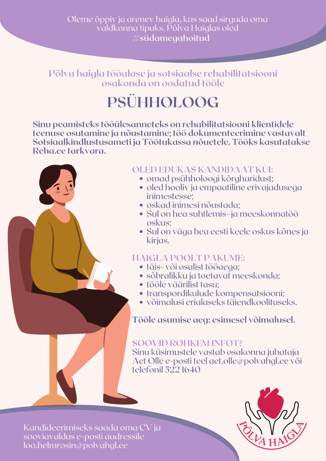 AS Põlva Haigla otsib tööalase ja sotsiaalse rehabilitatsiooni osakonda PSÜHHOLOOGI, kelle töö sisuks on sotsiaalsetele- ja tööalastele rehabilitatsiooni klientidele teenuse osutamine/nõustamine.