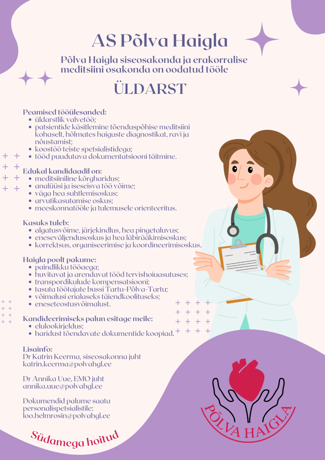 Põlva haigla õendusabi osakonda on oodatud tööle ÜLDARST, kellel on lai vaade patsiendile kui tervikule ja valmisolek pakkuda kvaliteetset ravi krooniliste ning pikaajalise hooldusvajadusega patsientidele.