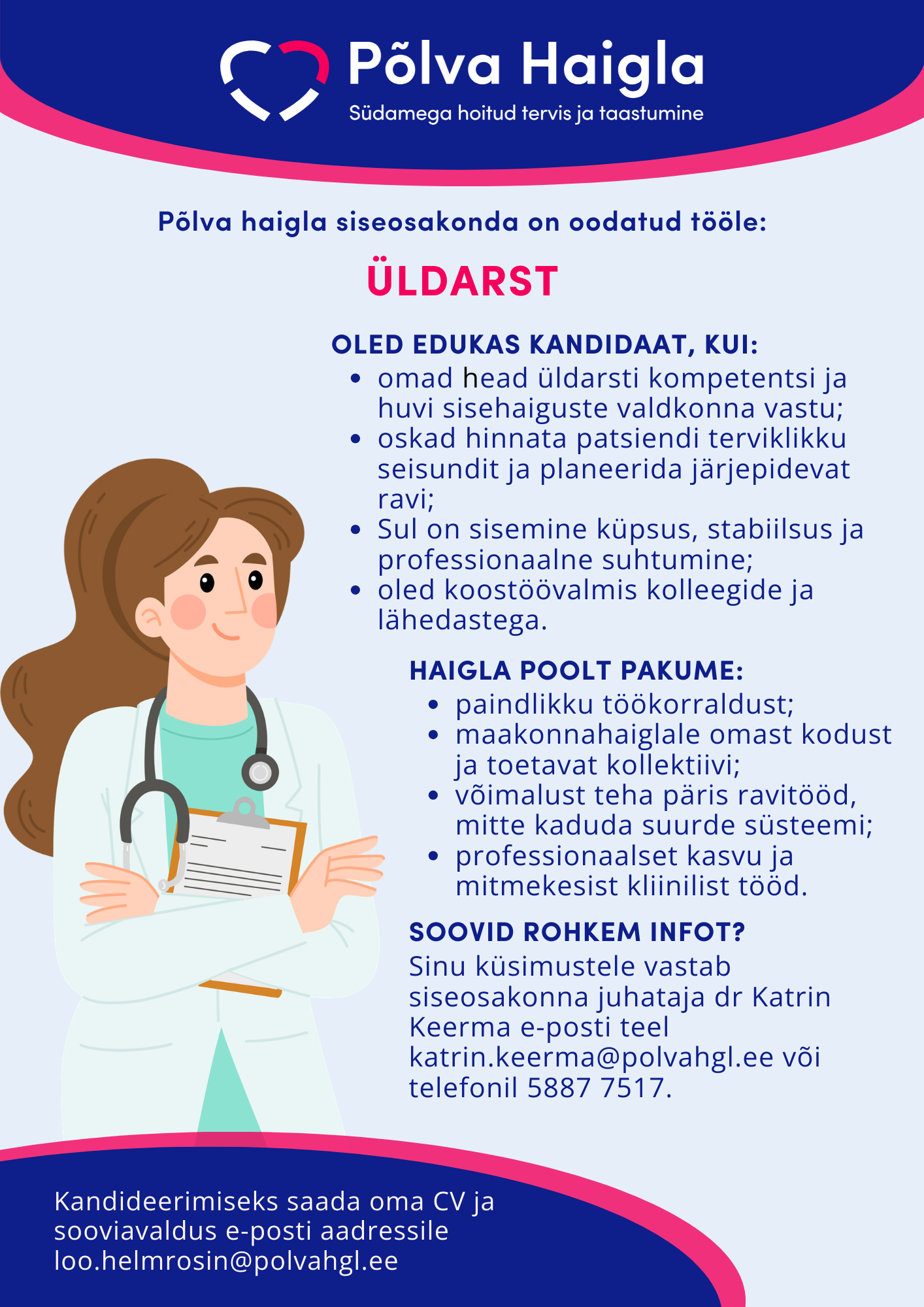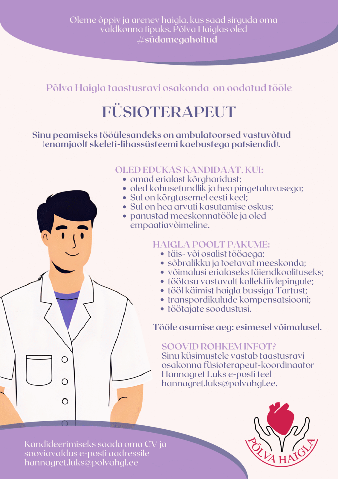 Kui tunned, et sinu tugevus on inimlikkus, rahu ja oskus näha patsienti tervikuna, siis Põlva Haigla võib olla just see koht, kus sinu töö saab kõige suurema tähenduse.