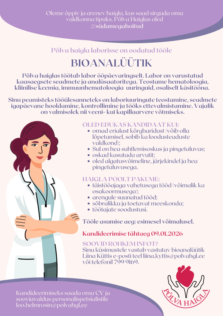 Dokumendid palume saata personalispetsialistile: loo.helmrosin@polvahgl.ee