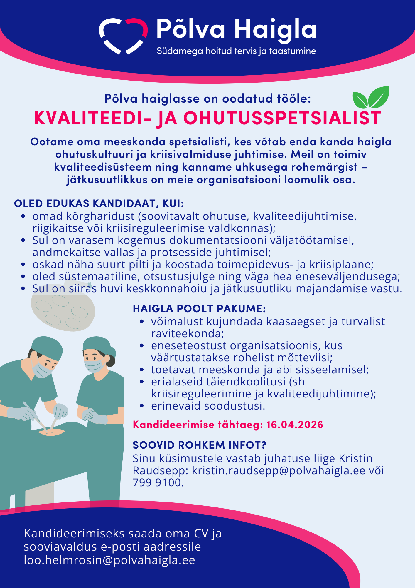 Sinu küsimustele vastab juhatuse liige Kristin Raudsepp: kristin.raudsepp@polvahaigla.ee või 799 9100.